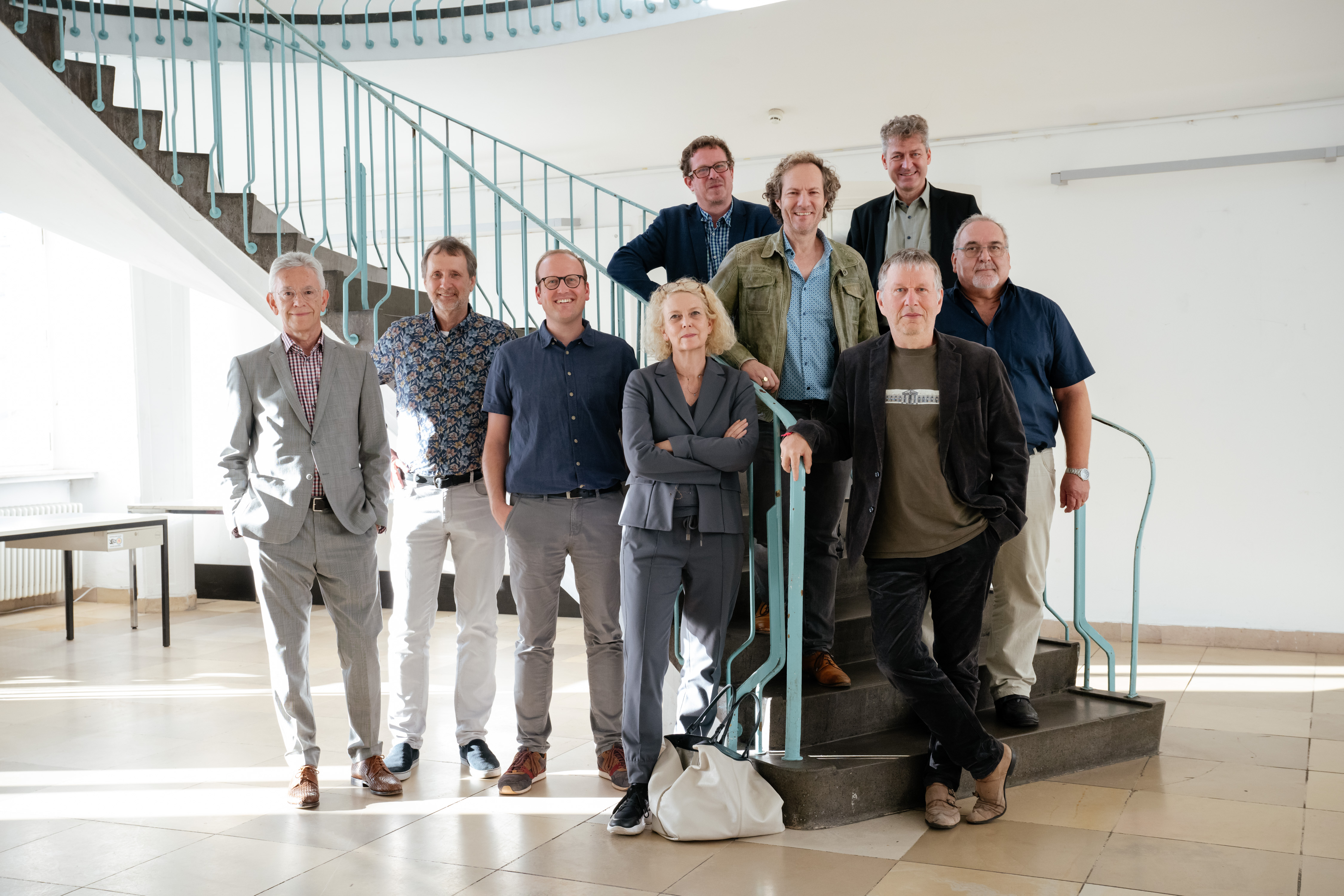 Die Jury am 19.06.2023 in der hbkSaar, v.l.n.r., 1. Reihe: Prof. Ivica Maksimovic, Axel Uhle (Organisation der Sitzung, kein Mitglied der Jury), Simon Matzerath, Dr. Sabine Dengel, Thomas Roessler, 2. Reihe: Prof. Dr. Alexander Schubert und Reiner Jung, 3. Reihe: Eric Schrader und Dr. Ralf Beil © Historisches Museum Saar, Oliver Dietze