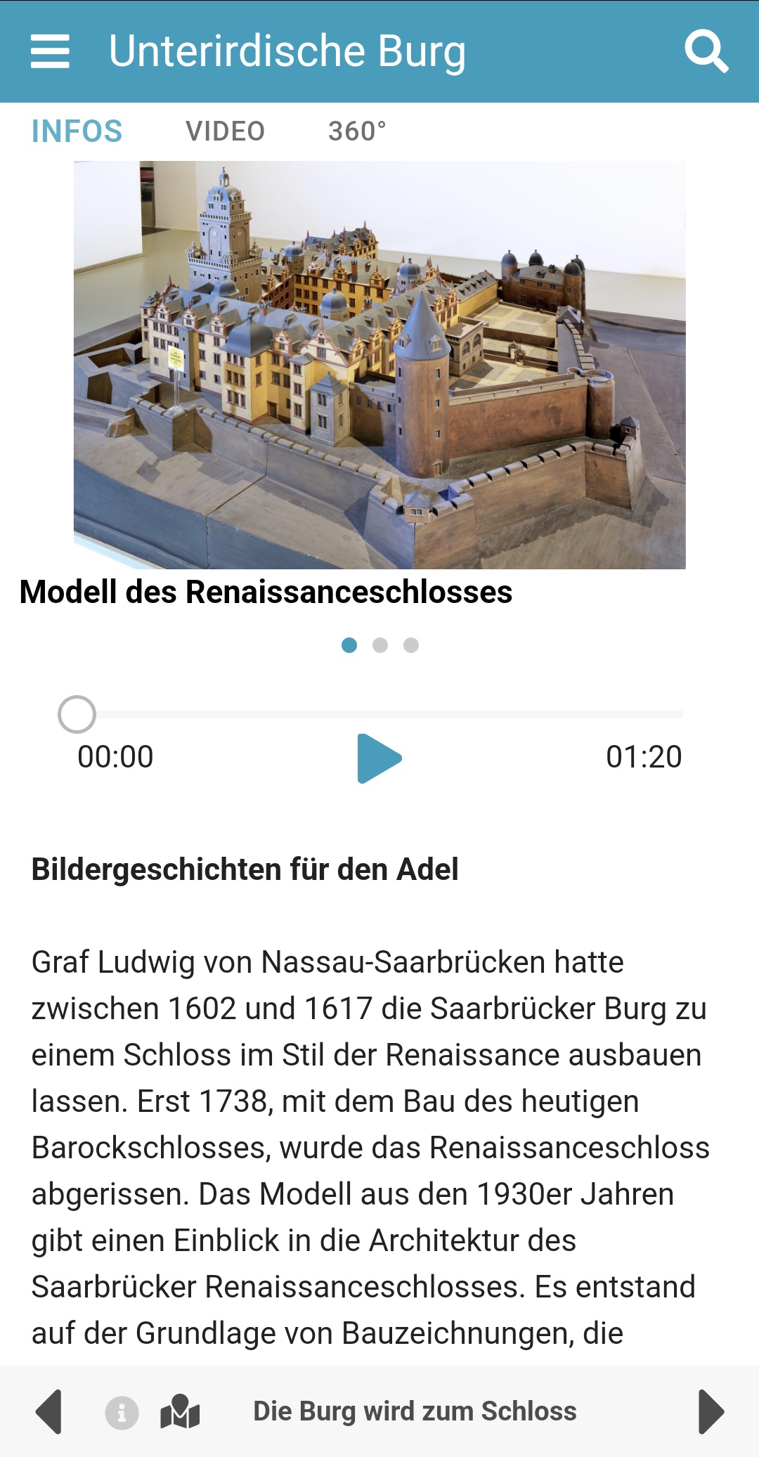 Das Historische Museum Saar bietet einem internationalen Publikum die Möglichkeit zu einer faszinierenden Zeitreise und die unmittelbare Begegnung mit originalen historischen Orten und Schauplätzen. Doch auf 2700 m² Ausstellungsfläche mit fünf Abteilungen und zwei Ausgrabungsbereichen verliert man schnell den Überblick. Besonders, weil diese größtenteils unterirdisch und weit verzweigt in den Kellergewölben des Schlosses liegen. Die neue App des Museums schafft Abhilfe. Mit deren Highlight-Touren zur Saargeschichte und den Ausgrabungsbereichen der Unterirdischen Burg, haben Besucherinnen und Besucher alle wichtigen Objekte im Blick.